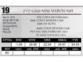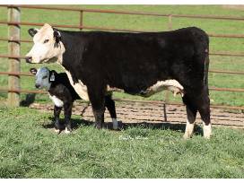 G110 is a first calf heifer with a beautiful udder that should last her for a lifetime. She is a double bred progeny of the R&R Curve Bender bull. She is purebred (89.5%) and sells with a two-month-old Press On heifer by her side.