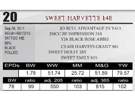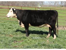 14E is an Impression daughter, she is polled and 86% Black Hereford. She is another great uddered female. We really hate to part with her but we wanted to offer some of our best potential young cows in this sale. She is a second calf heifer and comes with a month old Press On bull calf at her side.