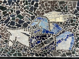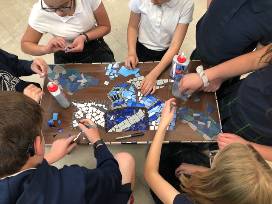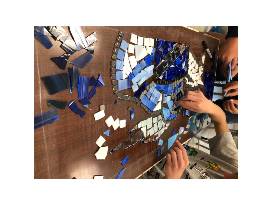 Current 6th grade students and last year's 6th grade students designed and created a sea glass and tile mosaic table. Mrs Hultgren joined and helped grout the table to completion. You want to own this original piece of artwork!