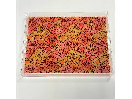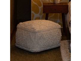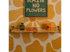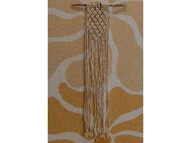 This item includes a green shag rug (4x5.3 ft.), handmade macramé by artist MeKeane, woven bohemian poof, wall shelf, two (2) pillows, retro floral serving tray and mid century modern night stand.