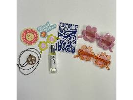 Items include: "No Rain, No Flowers" art, two (2) clear umbrellas, two (2) daisy sunglasses, peace necklace, four (4) stickers, custom made Notes of Woodstock perfume (15 mL), Raindrops Metallic Silver Beaded Curtain (3ft x 6ft)