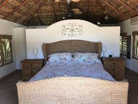 Casa Escondida (hidden house) was our home for close to a decade and today we love sharing it with surf families and adventurers from around the globe. It has all the amenities of a functional family home in a lush garden setting with peekaboo views of the surf at Zippers. The house is three stories with a master suite on the top floor. Laying in bed under the cover of a traditionally built Mexican Palapa Roof you will enjoy amazing views of the Sea of Cortez and the surrounding mountains. On the middle floor there is a comfy patio with a propane BBQ and seating that is perfect for evening cocktails. A beautifully remodeled kitchen, adequately sized dinning room, festively decorated half bath and a spacious living room are located on the middle floor as well. On the bottom level you will find our laundry room, two more bedrooms with queen beds, a full bathroom and a large great room. In total there are three bedrooms with beds for 6 but there is plenty of room to use our air mattresses for the little ones if you need more sleeping space. We also have a pack-n-play for a toddler. The yard is fenced and lushly landscaped with Coco Palms, Date Palms, Mango Trees and Mexican Fan Palms. The outdoor shower is a perfect way to finish off a morning surf and the "Cuatro De Las Tables" is right around the corner to store your boards out of the intense Cabo sun.
