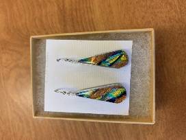 Earrings: Made by Glass Studio, these earrings are handcrafted in the studio located outside Asheville, North Carolina. The glass requires multiple firings at over 1400 degrees for many hours to produce these beautiful colors. Each color combination is unique, so no two pieces are ever exactly alike.