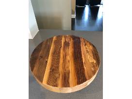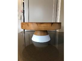 The Mod Block Cake Stand was handcrafted from reclaimed wood. This cake plate is accented with a splash of white paint around the base. This decorative piece is hand-crafted from reclaimed wood. Due to the nature of the found beams, each piece will contain varying crevices and splits within the wood, embracing its organic beauty even further. 14" diameter x 6" high