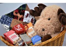 Do you have a sweet tooth? Do you like to be cozy under a soft blanket? Look no further! This basket comes stocked with three flavors of covered popcorn, maple pecan coffee grounds, a large mug for that coffee, a cozy lap blanket, and a large moose to cuddle with.