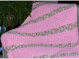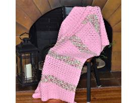 - Buttery-soft Hand Crocheted Afghan in pale pink with cream and tan accents, measures 80" x 40"