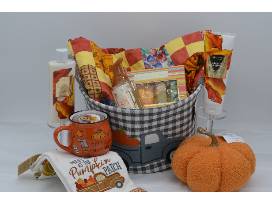 - Comes packaged in a grey and white plaid cloth basket decorated with a grey truck carrying pumpkins.