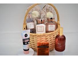 This basket defines warm, cozy, and luxurious. The lotion, body spray, and shower gel have notes of rosé, star jasmine, and warm white amber. The slippers will be a cozy welcome to help you relax and unwind after a hard day at work, and the tobacco room spray will help keep your home smelling delightful to keep you in that serene state. There are also face scrubs and a lip scrub and balm set to continue the pampering.