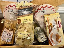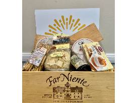 Bottle of Far Niente Napa Valley Chardonnay with gourmet pastas, cookies, and specialties.