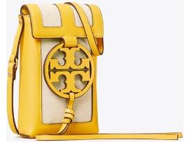 Carry your tech accessory in true style with the Tory Burch Miller Canvas Quadrant Phone Crossbody. Flap with magnetic closure. Adjustable crossbody strap. Exterior back slip pocket. Signature logo detail at front. Fits all phone sizes up to an iPhone 11 Pro and Samsung Galaxy Note 10+. Lined interior. Measurements: Bottom Width: 4 1 4 in Depth: 1 in Height: 7 in Strap Length: 50 in Strap Drop: 25 in Weight: 7 oz. Color: yellow