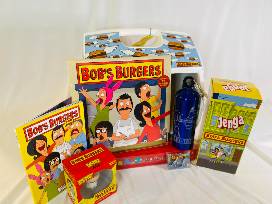 Inside the basket is a Bob's Burgers Music Album Vol 2, Bob's Burger's Cooler, Jenga, Calendar, Water Bottle, Collectible Pins & Funko.