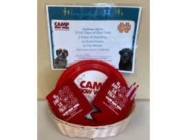Treat your pup to a pawsitively fun & safe experience! Camp Bow Wow offers premier dog day care, dog boarding, dog training, in-home pet care & more. This basket includes 3 full days of day care, 2 days of boarding, 2 can coozies, 2 pens, 1 frisbee, and 1 magnet.