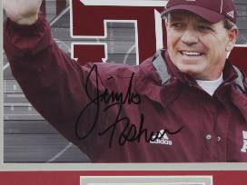 1Jimbo Fisher is the current head coach for the Texas A&M football team. Since becoming the head coach in 2018, he has led to team to consecutive winning seasons. He was previously head coach for Florida State, where he led them to become national champions in 2013. All memorabilia include a Certificate of Authenticity (COA) from Allstar Charity Services.