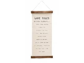 This Lake Rules hanging sign has a printed sentiment canvas features mango wood weights and cotton rope loop hanger.