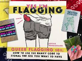 Yes, I'm Flagging: Queer Flagging 101: How to Use the Hanky Code to Signal the Sex You Want to Have zine by queer cartoonist, Archie Bongiovanni (creator of LGBTQ+ comic, Grease Bats). PLUS! An assortment of original items also created and donated by Archie, including iced coffee enamel pin, What A Time To Be Gay And Alive Bumper Sticker and a signed copy of Quick And Easy Guide To They/Them Pronouns