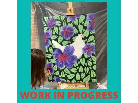 Josie Cammarata will paint live between 6:30 pm-10:00 pm on May 7; artwork is considered finished at the time of auction close on 5/7/2022 at 10:00 pm, and is sold as it is at that time. Winners of artwork at Wall Ball will bring artwork home with them at conclusion of event.