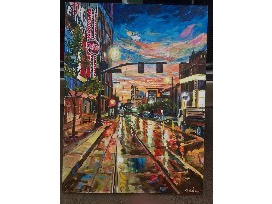 What could be more exciting than witnessing a beautiful painting come to life before your eyes? Paul Eade will paint his Kansas City-themed cityscape Reflections on Mainstreet consisting of a 48" x 60" acrylic painting on canvas at the Seeds of Hope Gala on the evening of April 29th, 2022. Please see attached photo for a sneak peek of what the painting will look like (NOTE: this is not an exact representation of how the painting will appear). After the event, Paul Eade will take the painting to his workspace to clean it up and get it ready to go, after which it can be shipped to you (shipping costs not included).
