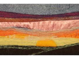 Artist Statement: Inspired by Kansas skies, I make landscapes large and small from fabric scraps and other sewing supplies. All materials are recycled and repurposed from undetermined fiber content and unknown vintage materials.