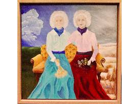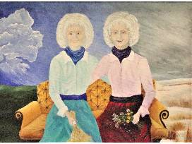 Artist Statement: When I met them, I thought the sisters had a very intriguing look. How interesting it would be to go through life with someone who looked like you. Seeing yourself in another person couldn't be clearer. It also made me think of Frida Kahlo's "The Two Fridas," so I decided on a similar pose but with the symbolic natures of shared expansion and contraction of a lifetime in the background with personality differences symbolized in the plants they are holding.