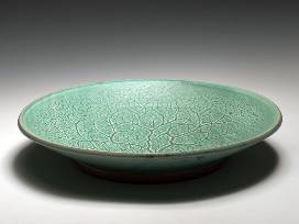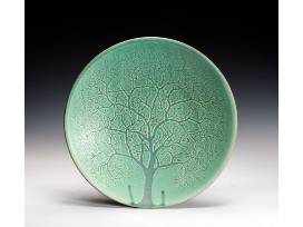 Did you know that Michael has wood-burning kilns on two continents and puts them both to use each year? That's right, he built himself a kiln in Ireland where he and his wife, Mary, go to visit her family each summer! This exceptional seafoam green shallow bowl features a hand-carved tree scene complete with little birds and some glaze runs that look like fence posts just slightly in the distance. This piece will make you think about both familiar and faraway places at the same time.