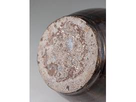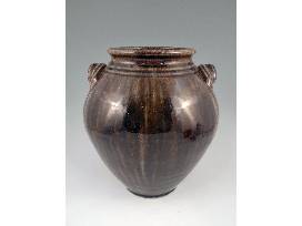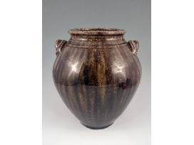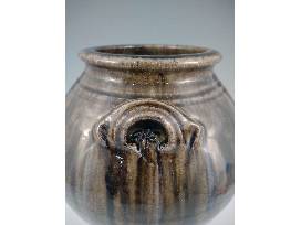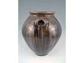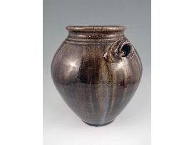 A native of Hickory, NC, Kim traveled, served, and ultimately went to Haywood Community College to learn pottery making. After returning and opening his first shop he became aware of the local Catawba Valley pottery tradition and sought out Burlon Craig, a renowned folk potter, at his shop in nearby Henry, NC. Burlon mentored him in finding and using local clay, firing a large groundhog kiln, and making the forms and glazes that distinguish Catawba Valley Pottery. Kim continues using local clay, glaze, and history as the inspiration for his contemporary take on the Catawba Valley tradition. This double-handled jar with its lug handles and alkaline glaze is a traditional Catawba Valley form. What makes this piece truly exceptional, besides its level of craftsmanship, is that the normally brown alkaline glaze came out with a greenish tint on this piece and there's some wonderful rutile blue on it as well! 11" H.