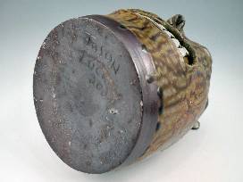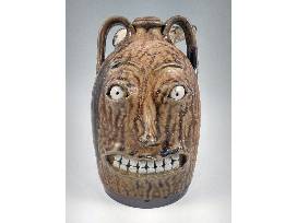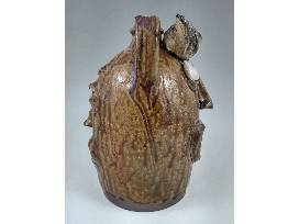 Sid, Jason, and Mandee collaborated to make this great traditional face jug. Sid turned the two-handled jug and added one face. Jason added the second face, and Mandee added a bird for an additional sculptural flourish! The glaze is Sid's "crawdad slip" which is normally green but turned wonderful honey and caramel colors in Sid's wood-fired kiln. A special piece! 8.5" H