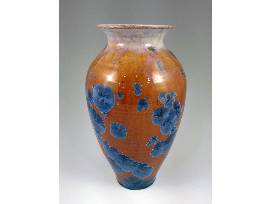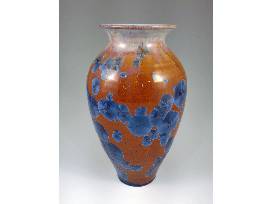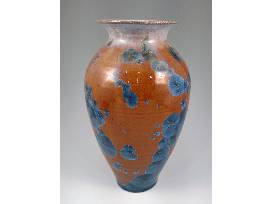 William and Pam are the sort of people who will do whatever they can to help no matter if you're a dog, cat, or human. Creating crystalline pottery involves art and science (or craftsmanship and magic, if you will) of growing crystals on pottery during the firing process. The colors in William and Pam's pieces come from nickel, copper, and/or cobalt in their glaze, and they also use zinc oxide. At a certain point in the process of firing the pieces, the zinc crystalizes and the result is a striking crystalline vase such as this one with its dramatic colors! 11" H