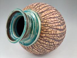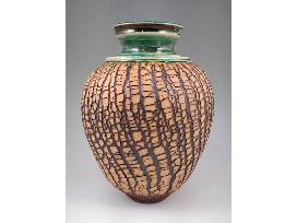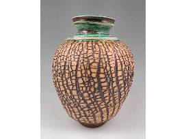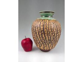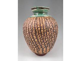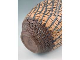 Based in Durham, NC, Delores is a younger potter who has only been working as a full-time potter since 2013 although you couldn't tell it by the quality of her wonderful work. She created this tree bark vase on the potters wheel using a dark groggy clay body before adding a contrasting slip which dries quickly. She then stretched this piece on the wheel to produce the unique and organic appearance of the outer surface. 10.5" H