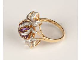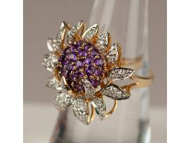 "Centered ring is a "Dome" of Round Faceted (tested) Amethysts, Each secured by Yellow Gold bead settings +/- one CTTW. Transparent, Medium slightly pinkish purple, no eye visible inclusions.