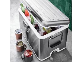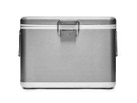 YETI V Series stainless steel cooler. Legendary insulation in a classic style with futuristic technology. Vacuum insulated panels, stainless steel body, aluminum hinges, stainless steel latch loop closure, wine-friendly packing, stainless steel handles, deep seal leakproof drain plug and Bearfoot non-slip feet.