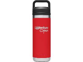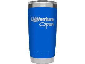 White YETI Roadie 48 hard cooler, U.S. Venture branded CorpRed 18oz YETI Rambler, and CorpBlue 20oz YETI Tumbler.
