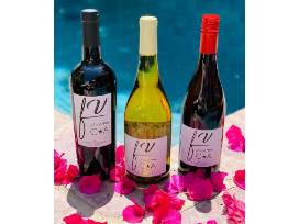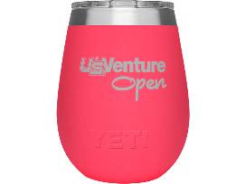 Fresh Vine Wine bottle of Rosé, Chardonnay, Sauvignon Blanc, Pinot Noir, Cabernet and Sauvignon, Fresh Vine Wine branded cutting board, U.S. Venture Open branded YETI Nordic Blue Hopper and YETI 4 Rambler Bimini Pink Wine Tumblers.