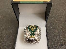 Giannis Antetokounmpo championship MVP bobblehead, Milwaukee Bucks Championship Replica ring and hat.