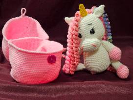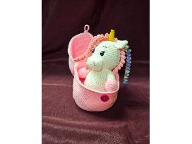 Intricate detailed crocheted unicorn with carrying bag.