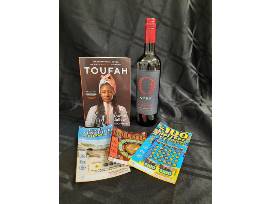 A bottle of Open Cabz Merlot, 3 scratch tickets and the book "Toufah".