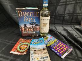 Prize includes a bottle of Ruffino Pinot Grigio, 3 scratch tickets, the book "Southern Lights".