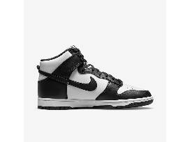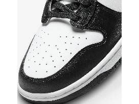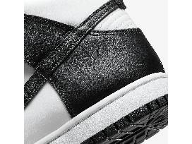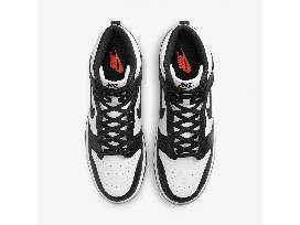 The Nike Dunk High Black White 2021 features a smooth white leather upper with perforations on the toe box. Black leather overlays, eyestays and Swooshes match the black laces. Orange hits on the insole add the Total Orange to the vintage White/Black colorway. The rubber outsole is black with a concentric-circles pattern for traction. The midsole is white with visible threading around the shoe. Black Nike branding appears on the white tongue and the heel features a black loop with arcs of white-on-white horizontal threading below it.