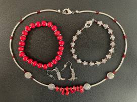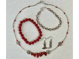 Set of handmade casual western-style jewelry. Includes 18" necklace, pair of earrings, and 2 bracelets. Jewelry is silver-plated and antique silver - no nickel. Red and silver beads.