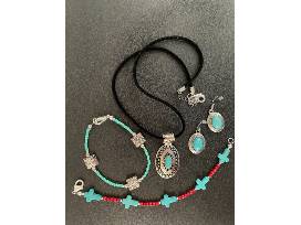 Set of handmade casual western-style jewelry. Includes 18" black-cord necklace, pair of earrings, and 2 bracelets. Jewelry is silver-plated and antique silver - no nickel. Turquoise with stained stone and silver.