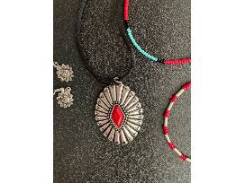 Set of handmade casual western-style jewelry. Includes 18" black-cord necklace, pair of earrings, and 2 bracelets. Jewelry is silver-plated and antique silver - no nickel. Red, silver and turquoise beads.