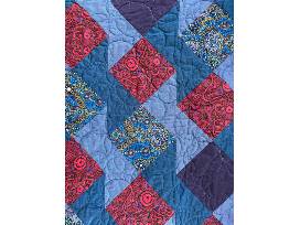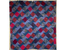 63" square quilt of shot cottons, solids and aboriginal prints. Seven-inch blocks on point, using the This Way Not That pattern by Jen Kingwell. Machine pieced and quilted.
