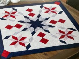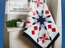 "Bursting in Air" table topper kit, size 36" x 36" from Riley Blake Designs. Patriotic red, white & blue fabrics are used in this pattern by Gerri Robinson of Planted Seeds Designs.