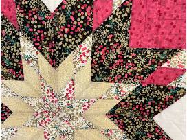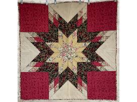 Christmas wall hanging or table topper measuring 41" square. Victoria Findlay Wolfe pattern, in rosy reds, light and dark holiday prints with gold accents.