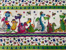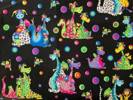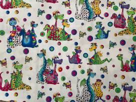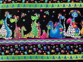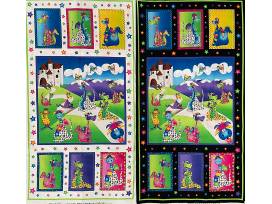 "Days of Yore" fabric line by Sue Marsh for RJR Fabrics. Includes 6 panels (each 23" x 41") - two with white background and four with black background. Four 4-yard cuts of coordinating fabrics (two each white and black backgrounds) plus 2 yard cut of coordinating colorful dots.