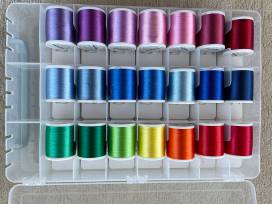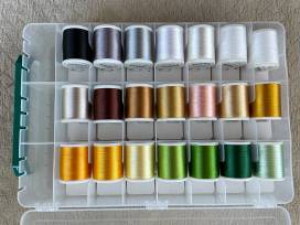 Madeira rayon embroidery threads in a hinged plastic storage container. Perfect for embroidery, quilting, decorative stitching on all sewing and embroidery machines. Box filled with 40 spools of 40 wt rayon thread, each spool is 1100 yards. Additional two spools white Bobbinfil, 70 wt, 1650 yards each.