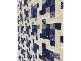Flying Square quilt measuring 78" x 96" in shades of blue and white with a blue print backing. Machine pieced and quilted.