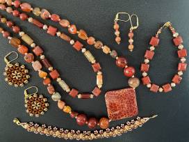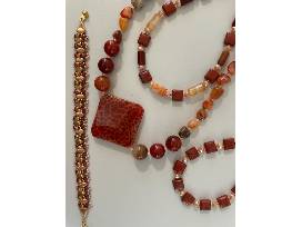 Jewelry set consisting of: two necklaces of Red Agate beads, both measuring 20", expandable to 23", to be worn together or separately; two bracelets to fit 7 1/2" wrist; two pairs of leverback earrings for pierced ears. All findings are gold metal.