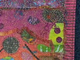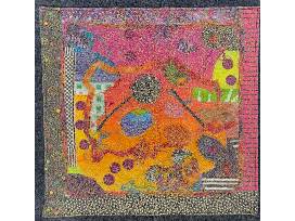 This improvisational collaged and quilted wall hanging was begun in a workshop on "Creating A Ghost: Layered Wholecloth Hand Quilting" by Heidi Parkes. Choosing a defiantly colorful palette, the artist layered assorted gaudy fabric scraps, silk threads, and variegated yarn on top of a batting and backing. The whole piece was covered by gold synthetic lace and hand stitched around many of the elements. Measures 19" x 19".