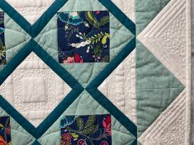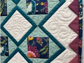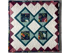 Set of two small wall hangings, using same green fabrics but with two different border techniques: one with pieced border measuring 18" x 18"; the other with prairie points inserted, measuring 17" x 17". Both machine pieced and beautifully quilted.