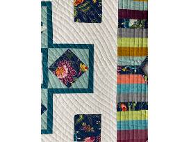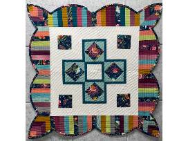 The third wall hanging created to explore different border treatments. A pieced border of coordinating solid stripes with the feature fabric stripes is enhanced with a scalloped, bound edge. Measures 27.5" x 27.5". Machine pieced and quilted.